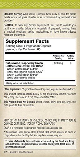 Each NatureWise Green Coffee Bean Extract capsule contains approximately 20 mg of caffeine, about the same as one cup of decaf coffee.