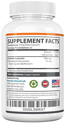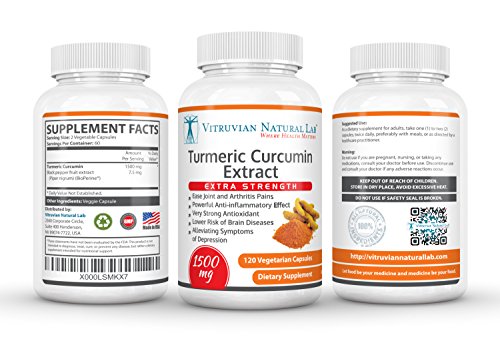 -. Binding : Health and Beauty -. Brand : Vitruvian Natural Lab -. EAN : 0820103268141 -. Feature : Along with black pepper extract, this potent supplement reduces inflammation & relieves joint pain / Can help destroy the toxic, beta amyloid plaques which are believed to contribute to memory loss / Helps support healthy liver function so your body is able to efficiently eliminate toxins / Helps stabilize blood sugar level, improve digestion & relieve menstrual cramps, for optimal health / 100% pure, raw, ground, root powder - 750mg Caps - Take daily as directed -. Label : Vitruvian Natural Lab -. Manufacturer : Vitruvian Natural Lab -. MPN : VNL-0004 -. PackageQuantity : 1 -. PartNumber : VNL-0004 -. ProductGroup : Health and Beauty -. ProductTypeName : HEALTH_PERSONAL_CARE -. Publisher : Vitruvian Natural Lab -. Studio : Vitruvian Natural Lab -. Title : Vitruvian Natural Lab - 100% Natural Turmeric Curcumin Extra Strength - 1500mg/serving - With BioPerine Black Pepper Extract -120 Capsules (Veggie) - Strongest Available in the Market -. UPC : 820103268141