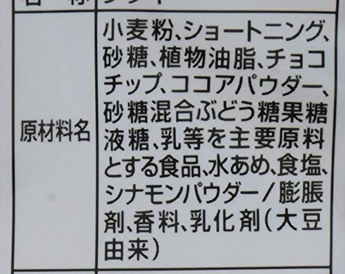 原材料:原材料名:小麦粉、ショートニング、砂糖、植物油脂、チョコチップ、ココアパウダー、砂糖混合ぶどう糖果糖液糖、乳等を主要原料とする食品、水あめ、食塩、シナモンパウダー/膨脹剤、香料、乳化剤(大豆由来)