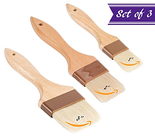 Product Description This commercial set of 3 high-quality pastry brushes is specifically designed for basting foods and for oiling or buttering bakeware, waffle irons and griddles, basting meats or spreading egg wash onto large pastry crusts. Ideal for marinading any type of meats. You can also use them for cleaning coffee grinders and spice mills. It's a simple toolset that can pay off big dividends. Just quickly brush your pastries with butter glaze before baking to get that golden-brown flaky crust that customers crave. Natural boar hair bristles that provide superior pliability and a more even spread and a lacquered wooden handle for a perfect grip. If you love making and serving delicious foods and are looking for a perfect gadget set to make your life easy, then search no further just click on Add to Cart Now to bring this essential toolset to your kitchen! 0