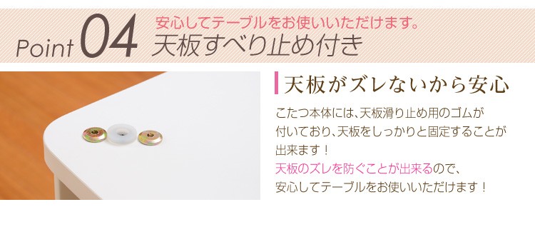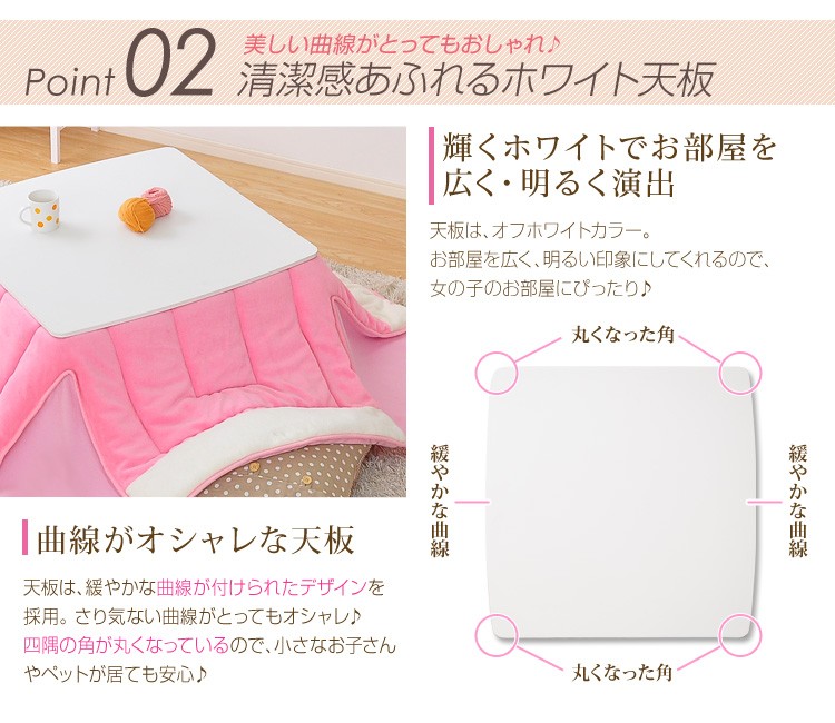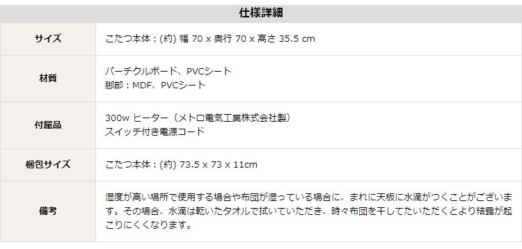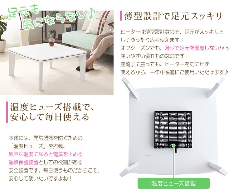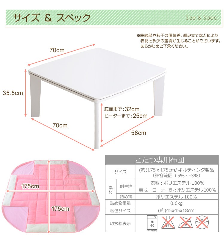【商品について】カジュアルホワイトこたつ【-Soneca-ソネカ(正方形・70cm幅)】(こたつテーブル+掛布団の2点セット)■サイズ:本体外寸:(約)幅70x奥行70x高さ35.5cm(約)11.74kg布団:(約)幅175x奥行175cm(約)1.7kg■カラー:本体:ホワイト布団:ピンク■素材:天板:パーチクルボード、PVCシート脚:MDF、PVCシート※付属品:300Wヒーター(メトロ電気工業株式会社製)・無段階温度調節機能、温度ヒューズ付・スイッチ付き電源コード布団:表地、裏地、詰め物:ポリエステル100%※洗濯可能(ネット使用)■その他:・完成品でお届けします。※脚はお客様取付け本体:(約)73.5x73x11cm(約)12.6kg布団:(約)45x45x18cm(約)2.7kg