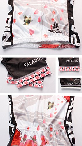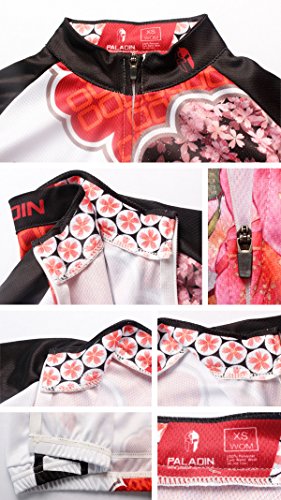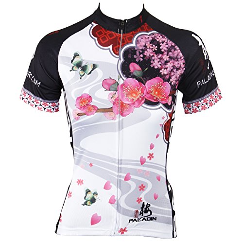 -. Brand : Paladin -. Department : Womens -. Feature : Breathable polyester with good function for keeping drying and cooling / Three rear pockets on the cycling jersey to carry some essentials while riding / UPF 30+ sun protection of this bicycle jersey and not easy to peel, fade or cracking pattern / Paladin short sleeve cycling jersey for women with high quality zipper, sliding through the 10000 test / Recommending you to select bigger one size or check the size instruction on product description part because of tight design -. IsAutographed : 0 -. IsMemorabilia : 0 -. Label : Paladin -. Manufacturer : Paladin -. MPN : P-542 -. PartNumber : P-542 -. ProductGroup : Sports -. ProductTypeName : OUTDOOR_RECREATION_PRODUCT -. Publisher : Paladin -. Studio : Paladin -. Title : Paladin Cycling Jersey for Women Short Sleeve Plum Flower Pattern Bike Shirt