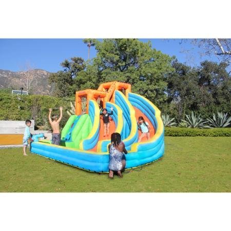 -. Binding : Toy -. Brand : Generic -. EAN : 0806374222389 -. Feature : Age Range: 3 to 8 years | Air blower has GFCI for safety | Constructed of durable puncture resistant material / 2 large water slides that lead to a splash pool | Inflates in 2 minutes / Climbing wall with padded grab handles | Dimensions: 13.6'L x 13.3'W x 9'H / 2 water cannons | Meets ASTM safety standards | Anchors, repair kits and storage bag included / Air blower included | Maximum weight limit 250 lbs total -. IsAdultProduct : 0 -. ItemPartNumber : INF-2011 -. Label : Generic -. Manufacturer : Generic -. MPN : INF-2011 -. PartNumber : INF-2011 -. ProductGroup : Toy -. ProductTypeName : TOYS_AND_GAMES -. Publisher : Generic -. Studio : Generic -. Title : Swimming Pools & Waterslides for Kids, Sportspower Twin Peaks Splash and Slide, Climbing Wall with Padded Grab Handles -. UPC : 806374222389
