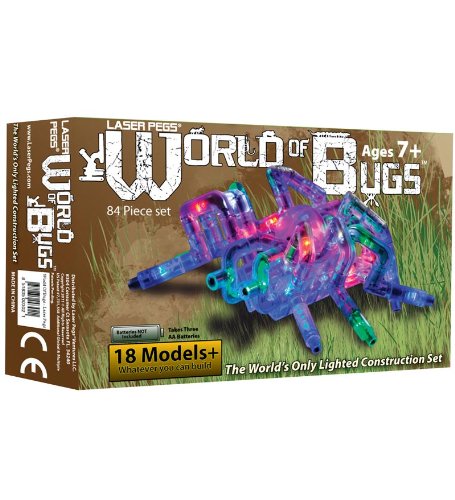 Light Up Building Construction Set - Laser Pegs - World of Bugs Deluxe Set (84 Pieces): Creepy, crawly lighted bugs? With this award-winning Laser Pegs® 84-piece set you can create 18+ models or whatever your mind can imagine! Power up with the included triangular power base. Requires 3 AA batteries or AC adaptor (not included.) Laser Pegs® are the only lighted construction set in the universe! Winner of the coveted Oppenheim Platinum Award, Dr. Toys 10 Best Toys and Dr. Toys Best Vacation Toy! Ages 5+