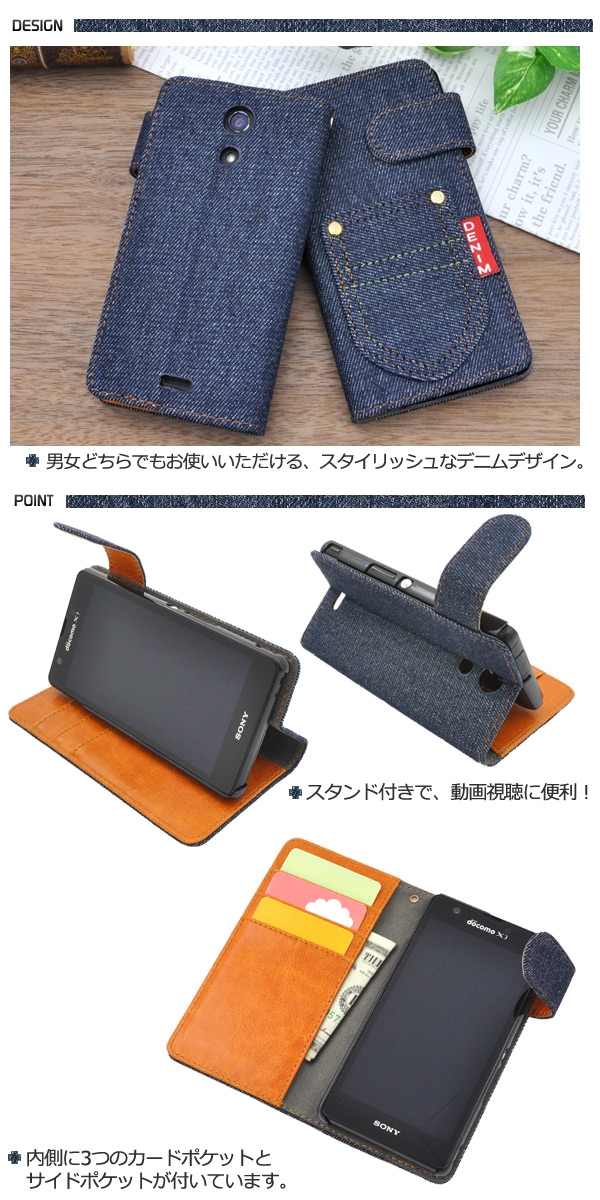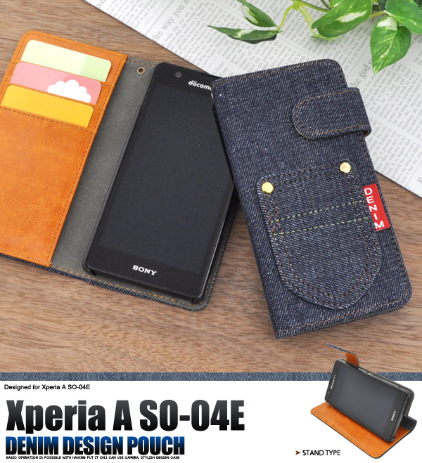 デニムデザインのXperia A SO-04E用スタンドケースポーチ。