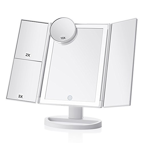 Tenmix Lighted Vanity Makeup Mirror, Trifold Mirror with 36 LED Lights, 10X/3X/2X Magnification, Touch Screen Dimming, 180 Degree Adjustable, Battery and USB Powered Countertop Light Up Cosmetic Mirro