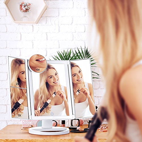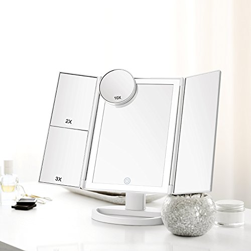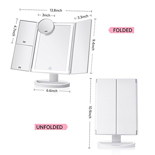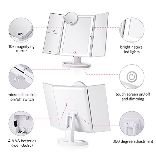 - 36 LED Upgraded Lighting: Tenmix Tri-fold makeup mirror is designed with 36 built-in 4 upgraded LED tape lights which offer you brighter, softer and more natural light, but not dazzling and protect your eyes. Pressing the touch switch to turn on/off, and hold to dim or brighten up. You don’t worry about making up in a dark environment or poorly lit areas any more!