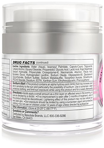 -. Feature : QUALITY - 2% Hydroquinone, 6% Glycolic Acid and Lactic Acid, B-WhiteTM Peptide, Vitamin E, Licorice Extract and Niacinamide helps even skin tone, brighten and diminish unwanted discoloration. / RESULTS - Fade stubborn dark spots, freckles, hyperpigmentation and melasma while refining and hydrating the surface of skin. / FACE, HANDS, NECK, PLUS MORE - Multi-purpose dark spot corrector can be used for external areas of the body including underarms, elbows, knees, intimate areas, and more. / DUAL ALPHA HYDROXY ACID - Glycolic Acid and Lactic Acid helps resurface the skin through exfoliation, helping to remove dirt, oil and impurities while boosting the effectiveness of the Hydroquinone treatment. / CONTAINS THE HIGHEST concentration of hydroquinone allowed without a prescription. Use for 4 weeks to visibly notice dark spots have faded and your complexion will be much smoother and more even toned.