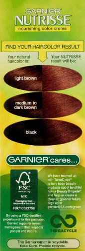 Experience Garnier Nutrisse, the nourishing color treatment that gives you rich, healthy-looking color. This exclusive color treatment, enriched with conditioners and fruit oil concentrate, penetrates deeps into hair fibers to deliver rich, long-lasting color that covers gray completely. Enjoy the unique avocado enriched conditioner that harnesses the restorative properties of avocado oil with Vitamin E. It protects against dryness while locking in color and moisture to keep your color radiant and your hair silky soft. With an easy application, you'll love coloring your hair with a nourishing creme formula enhanced with fragrant grape seed oil you only get from Garnier Nutrisse. The non-drip formula spreads easily and smells great when you color.