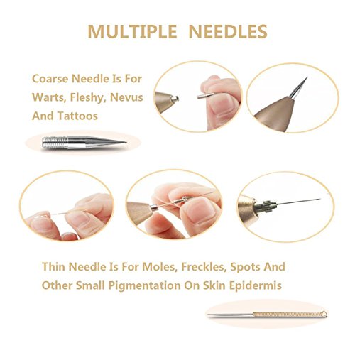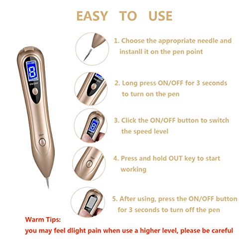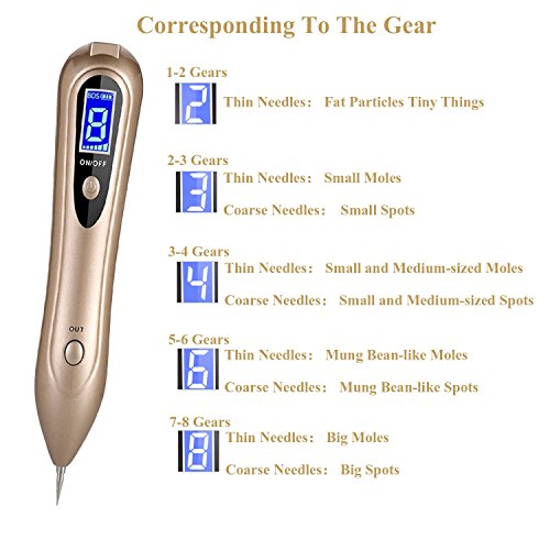 - Easy To Use: Only long press ON/OFF button for 3 seconds to power on or shut down, short press ON/OFF button to switch the speed level for its level 1 to 8. Hold down the OUT button throughout the process to make this product work. Lower level is used on spot and freckle. Strong level is used on mole and skin tags. Two kinds of needle - coarse needle and fine needle. The coarse needle is perfect for warts, fleshy, nevus and tattoos, the thin needle is perfect for moles, freckles, spots and more