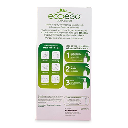 Studio : Ecoegg Ltd Publisher : Ecoegg Ltd Binding : Kitchen Product Description We all need to Spray Refresh our clothes, linen, rooms and upholstery from time to time. But why spend a fortune? Dilute at home with our Spray Refresh concentrate, save money and make your clothes and your home smell gorgeous. Pump the sumptuous Spring Blossom fragrance concentrate into dilution bottle Use more or less fragrance concentrate to suit your preference Fill dilution bottle with tap water and then spray Contains no harsh chemicals 0