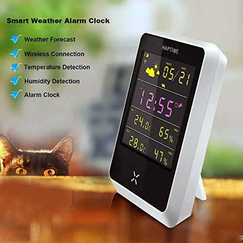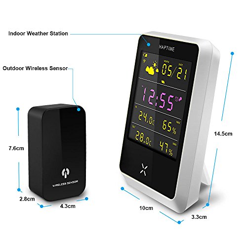 -. Feature : Excellent Digital Thermometer and Wireless Weather Station. It helps you simultaneously monitor indoor and outdoor temperature, humidity, forecast + Comes with Clock/Alarm / Remote Sensor Are Both Wireless. No messy cords, so you can place your sensor virtually anywhere (up to 300 ft line of sight, 100 ft under most conditions)to report on conditions in the greenhouse, garage, wine cellar or baby's room, places where proper temperature and humidity levels are crucial / The handy forecast icons let you know at a glance if it's going to be rainy, cloudy, or sunny based on barometric pressure trends / The weather station's main console displays a wide range of information in an easy-to-read format on a large LCD. The attractively thin console can be placed on a desktop / Equipped with an atomic clock for utmost accuracy in 12/24 hour format with time zone offset feature and month/day calendar. The clock also features an alarm with snooze