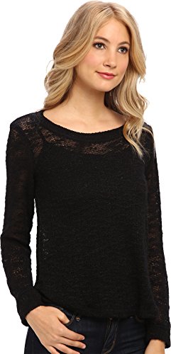 Long sleeve pullover top in a lightweight fabrication. Ribbed scoop neckline and cuffs. Curved hem. Materials: 62% polyester, 38% rayon.