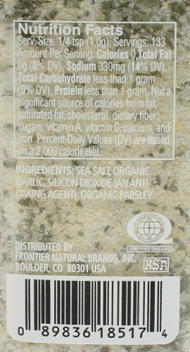 -. Binding : Grocery -. Brand : Simply Organic -. Color : default -. EAN : 0089836185174 -. Feature : 4.7 ounces; Glass bottle / A convenient, organic blend of two indispensible seasonings for use in every savory dish / Certfied Organic; Kosher / 1% of sales supports organic farming / A Brand of Frontier Co-op, responsible to people and planet -. Label : Frontier COOP -. LegalDisclaimer : NOTE: Actual product packaging may sometimes differ from image shown due to packaging updates & improvements by the manufacturer. We DO NOT P.R.Ice match. Tracking information/number provided upon request. We are a drop shipping company and items may come directly from the manufacturer's. We do not ship to PO BOXES. -. Manufacturer : Frontier COOP -. Model : 28638-BA -. MPN : 17065 -. NumberOfItems : 1 -. PackageQuantity : 1 -. PartNumber : 17065 -. ProductGroup : Grocery -. ProductTypeName : GROCERY -. Publisher : Frontier COOP -. Size : 4 oz. -. Studio : Frontier COOP -. Title : Simply Organic Garlic Salt Certified Organic, 4.7-Ounce Container -. UPC : 089836185174