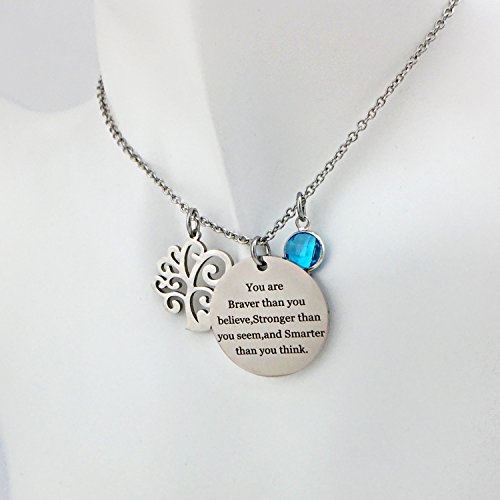 ♥MATERIAL♥: Birthstone necklace:1 birthstone charm + 1 "Family Tree" charm + 1 "You are braver than you believe Stronger than you seem and Smarter than you think" charm,316L Stainless steel.Inspirational necklaces.