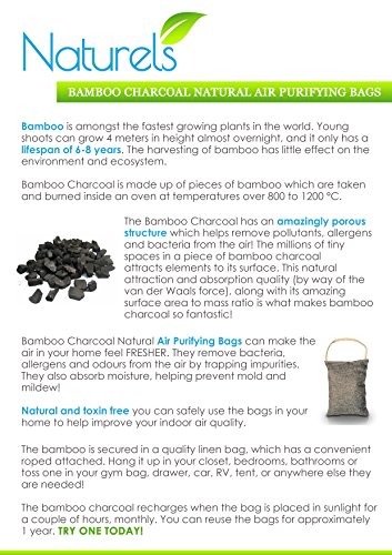 Our Natural Air Purifying Bags can make the air in your home feel FRESHER. Bamboo Charcoal has a porous structure that helps remove bacteria, allergens and odors from the air by trapping impurities. It also absorbs moisture, helping eliminate dampness and awful musty smells. A great step towards improving the air quality in your home!