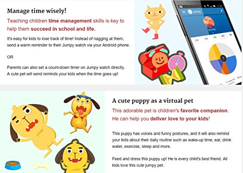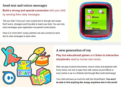 JUMPY is a multi-functional smartwatch for kids that monitors and interacts with your child's daily activities. With a colorful touch screen, 15 interactive games, intended for ages 4 years and older.