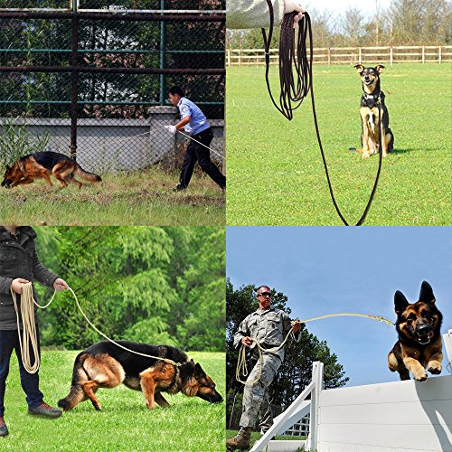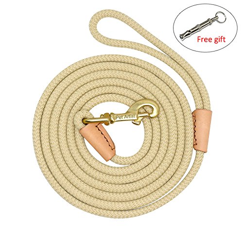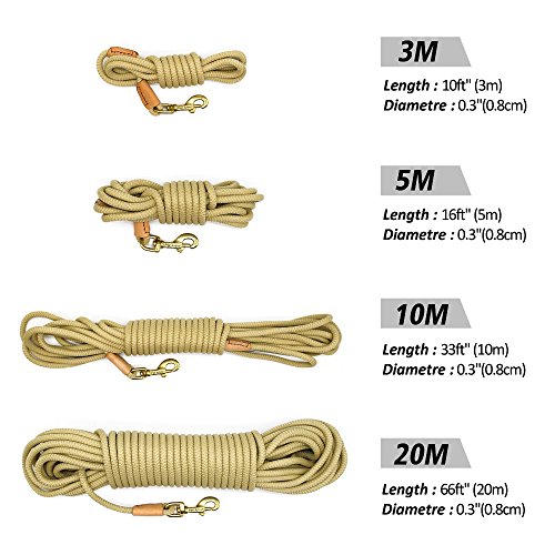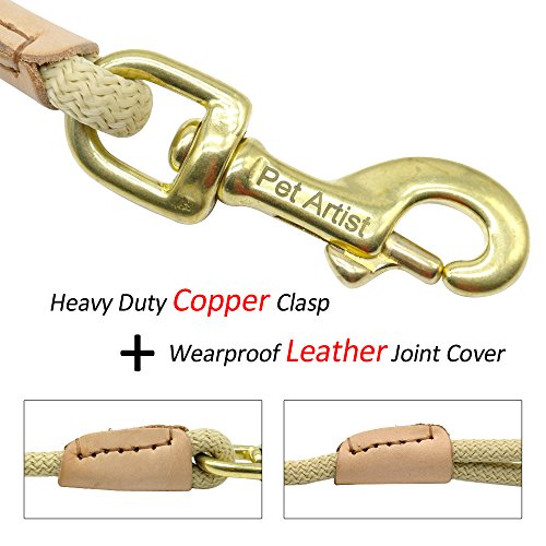 Pet Artist is prefessional dog supplies brand with more than 8 years experience in this field, especially good at dog training products, we aim at your great buying and using experience Various Sizes - 3/8inch diameter, length:10ft(3m),16ft(5m),33ft(10m),66ft(20m), 4 sizes fit for different training purposes and perfect dog control; Light Weight - The leash is very lightweight. Less than 33g/m, the longest size lead weight is just approx 1.5Ibs. It`s easy to carry so you don`t have to carry a heavy tracking leash while training; Heavy Duty - The leash can bear 180Ibs pull, the copper hook/clasp perfect for holding less than 100Ibs dog, such as German shepherd, Labrador, Golden retriever and smaller dogs breeds,etc; Wearproof Anti-rust - The outer layer of the leash is made of special braided nylon which is very wearproof and anti-slip than common rope lead, also the copper clasp/hook is anti-rust, the joints of leash and clasp with genuine leather cover to anti-wear , which make the leash durable and for long time using even in bad training/tracking environment; Easy to Clean and Store - The whole leash is washable better be dried by wind, the clasp/hook is anti-rust, so the leashs is perfect for using on the beach, outdoor adventure, etc;
