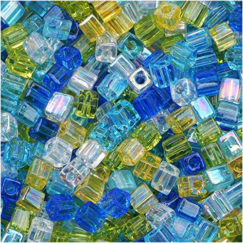 Miyuki 4mm Glass Cube Beads Color Mix Lagoon Blues Yellows 10 Grams