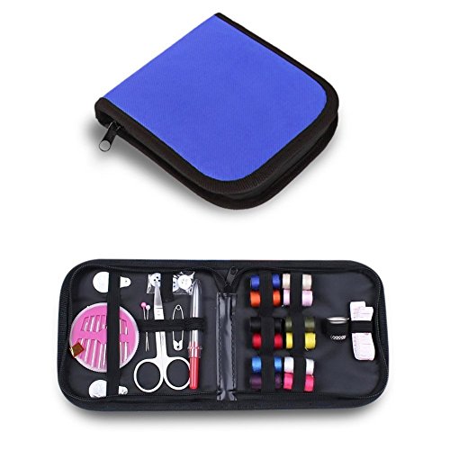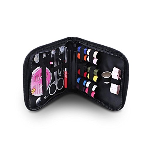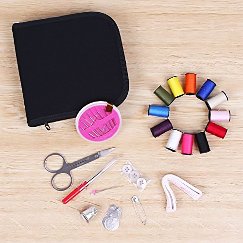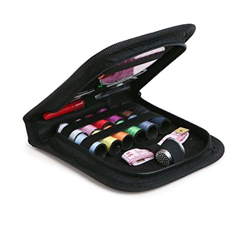 - EVERYTHING YOU NEED IN ONE COMPACT KIT - Stainless steel scissors, measuring tape, 12 colored threads with extra-long black and white, 24 needles,1 safety pin, 3 white buttons, 2 needle threaders, 2 color pins, seam ripper and thimble