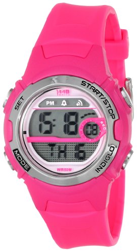 -. Feature : Round sport watch with date display and silver-tone pushers / Quartz movement with digital display / Protective acrylic dial window / Features Indiglo night-light, 24-hour chronograph/stopwatch, timer, and buckle closure / Water resistant to 165 feet (50 M): suitable for swimming and showering