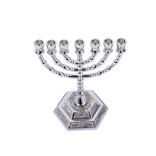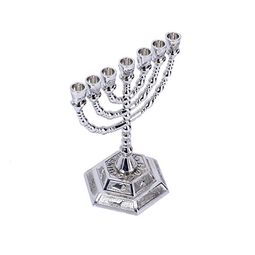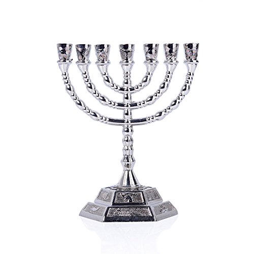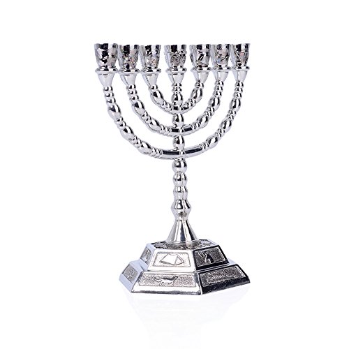 12 Tribes of Israel Menorah, Jerusalem Temple 7 Branch Jewish Candle Holder (5 Inches, Silver)