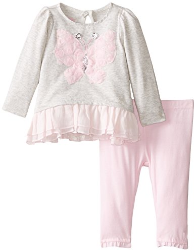 Chiffon top with butterfly applique and attached skirt with ruffled bottom. Legging