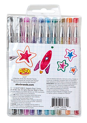 -. Binding : Toy -. Brand : ALEX Toys -. Department : baby-girls -. EAN : 0731346097620 -. Feature : Gel pens are so much more fun than your ordinary pen and add something special to writing and doodling / Gel ink glides smoothly on paper / Ink comes in an assortment of vibrant metallic colors / Includes (10) gel pens / Recommended for children age 3 and up -. IsAdultProduct : 0 -. ItemPartNumber : 976M -. Label : ALEX Toys -. Manufacturer : ALEX Toys -. Model : 976M -. MPN : 976M -. PackageQuantity : 1 -. PartNumber : 976M -. ProductGroup : Toy -. ProductTypeName : TOYS_AND_GAMES -. Publisher : ALEX Toys -. Studio : ALEX Toys -. Title : ALEX Toys Artist Studio 10 Metallic Gel Pens -. UPC : 731346097620 -. Warranty : No Warranty