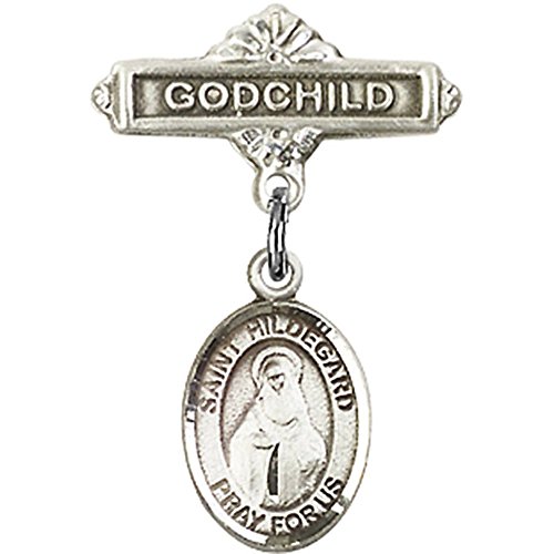 -. Title : Sterling Silver Baby Badge with St. Hildegard Von Bingen Charm and Godchild Badge Pin 1 X 5/8 inches