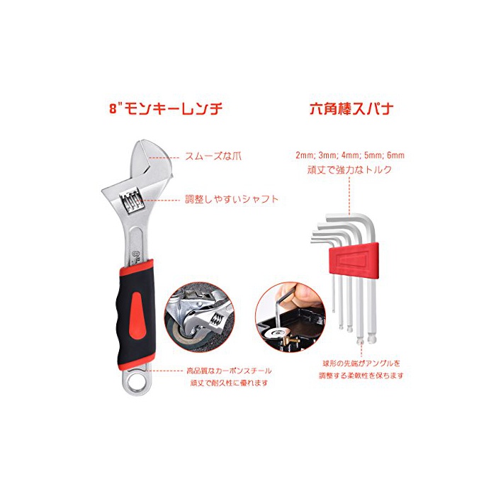 【날마다 간편하게 사용하는 공구 세트】8인치 멍키 렌치,6인치의 콤비 프라이어,드라이버(+고,-)고, 나이프,회중전등,검전드라이버,줄자(3m)고, 점착 테이프,nail 해머 등 상용인 공구도 대비해 있고,정밀 드라이버나 육각봉 스패너의 세트,차이 입각 소켓,비트의 세트 등도 포함됩니다.