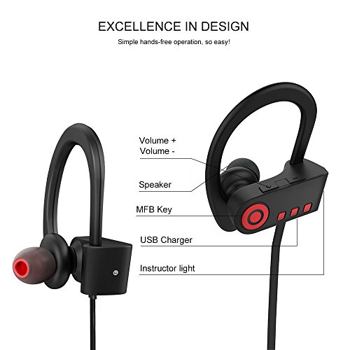 -. Feature : REAL HD & HiFi STEREO HEAVY BASS SOUND:The Featuring latest Bluetooth 4.1 CSR technology and Comfortable structure design that produce a high standard sound quality with deep bass and acoustic christmas. / CONVENIENT TO CARRY & SIMPLE TO USE:The design of the cabinet, With a portable bag, when you exercise, sport, rest at any time to enjoy the charm of music;Easy to use, convenient control : Previous / Next, Pause/Play, Volume Control. / SECURE IPX4 WATERPROOF & COMFORTABLE:Multiple waterproof design, Ergonomically designed flexible ear hooks with gel flex silicone earbuds to ensure your head stay comfortable. / LONGEST BATTERY LIFE:The high capacity and improved lithium polymer battery allows enjoyment of music for up to 8 hours and 250 hours stand-by with a quick charge of only 2 hours. / 12 MONTHS WARRANTY:12 months warranty and 30 days no-questions-asked exchange or return policy. Value for money guaranteed. Friendly customer service and prompt support for every customer.