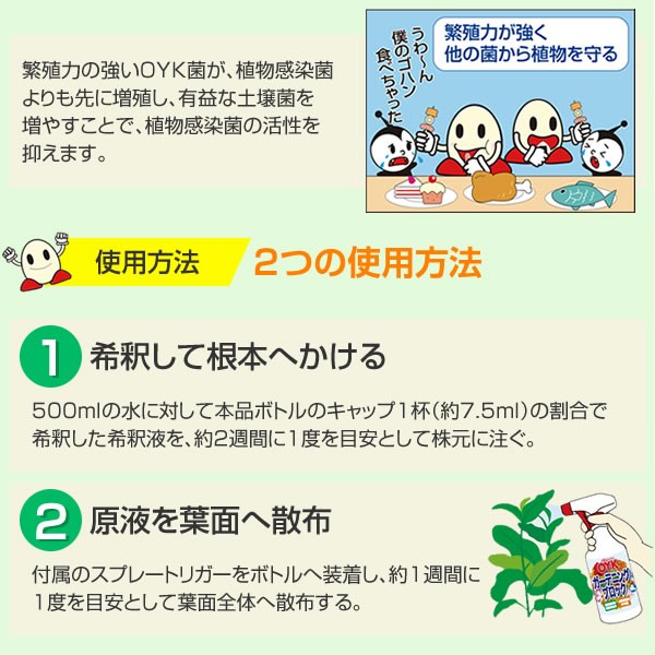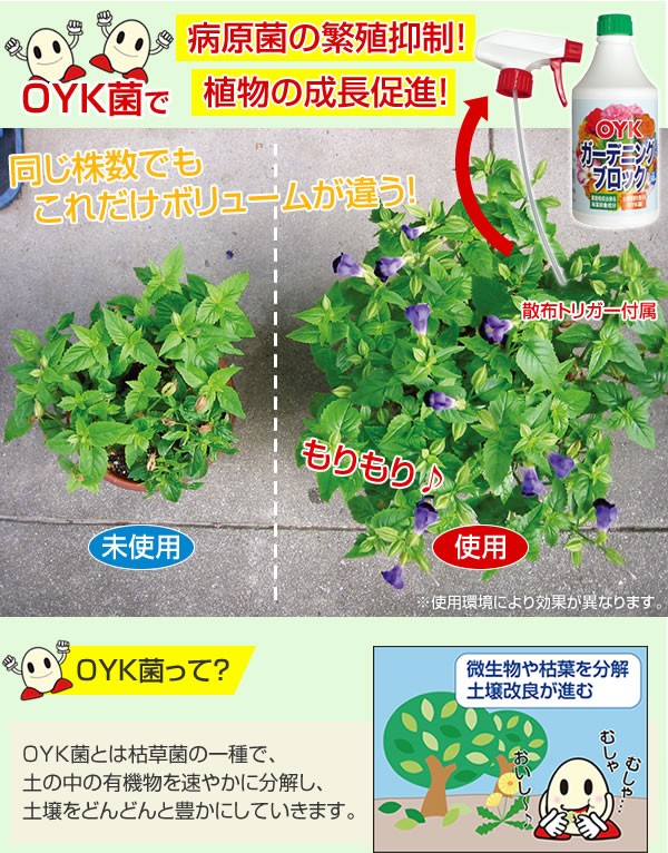 | 枯草菌の一種であるOYK菌が土の中の有機物を速やかに分解♪土壌をどんどんと豊かにしていきます。OYK菌は繁殖力が強く、植物感染菌などよりも先に増殖することで有害な細菌の活性を抑えて植物を守ります! |