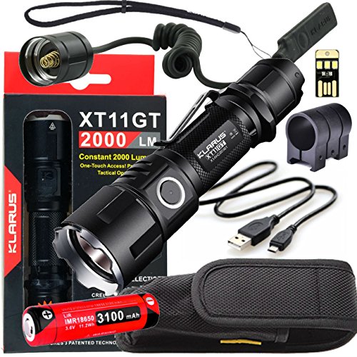 Klarus Upgraded XT11GT WEAPON BUNDLE w/ Tactical Rechargeable Flashlight, 18650 Battery, TRS1 Remote Pressure Switch, Onset Gun Mount, USB Cable, Lanyard, Holster, Pocket Clip, and USB Mini Light