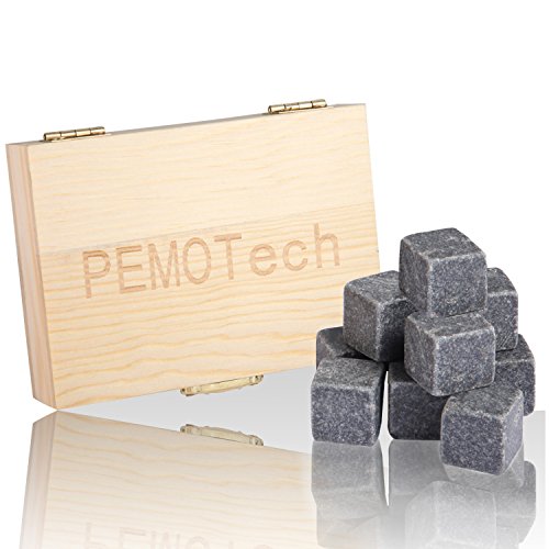 Whiskey Stones Gift Set, PEMOTech 9PCS Granite Drinking Rock for Keeping Whiskey, Wine and other Beverages Cool Longer, No Dilution Whiskey Chilling Rock, Ice Stone with Wooden Gift Box & Velvet Pouch