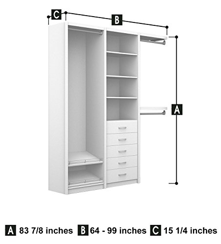 Measures 84" H x 99" W x 15.2" D when assembled as pictured; Top shelves and hang rods can be easily trimmed if necessary to fit closets 64" - 99" W