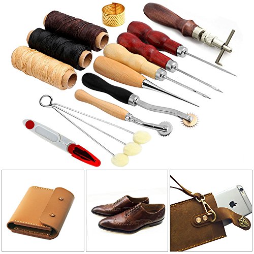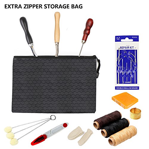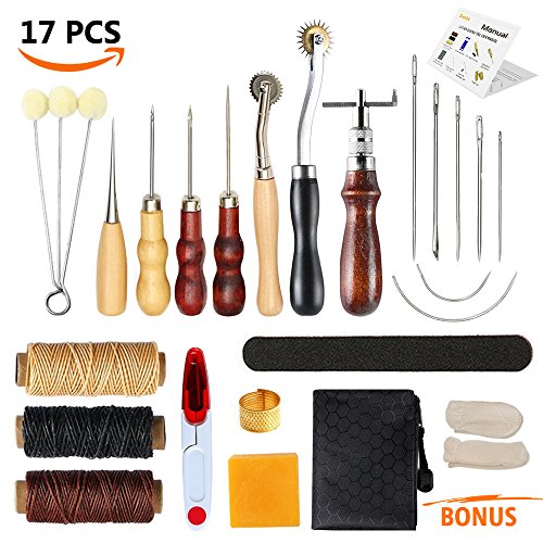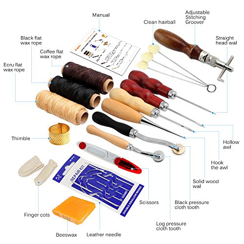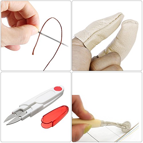 - 17PCS HAND STITCHING SET : This leather tools set includes 2pcs Pressure cloth tooth(4mm,2mm), 4 types of Awl, 3 colors threads, Adjustable groover, needle kit, Thimble, Beeswax, scissors and Finger cots, can meet your basic needs for leather crafts.