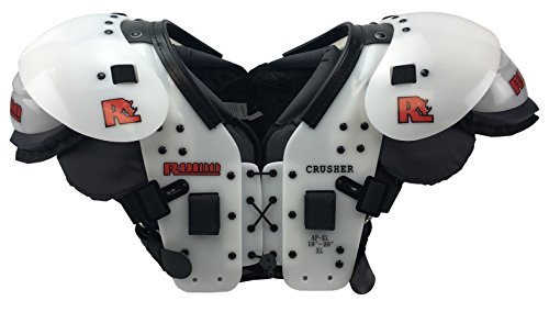 Varsity football shoulder pads Positions: Running Back (RB) and Defensive Back (DB) Air Flow System disperses impact energy on contact for maximum protection Shoulder Protection System ensures ultimate shoulder protection without sacrificing mobility Low profile, flat pad design with swim cut arches offers enhanced freedom of movement and improved arm motion Breathable body with shell vents helps increase air circulation and comfort Stainless steel hardware Swivel fronts Model: Rhino Crusher