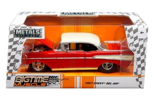 -. Brand : Jada -. EAN : 0801310989449 -. Feature : Rubber tires. Brand new box. Detailed interior, exterior. Has opening doors, trunk and hood. Made of diecast with some plastic parts. Dimensions approximately L-8, W-3.75, H-3.25 inches. -. IsAdultProduct : 0 -. Label : Jada -. Manufacturer : Jada -. MPN : 98944 -. PartNumber : 98944 -. ProductGroup : Toy -. ProductTypeName : MODEL -. Publisher : Jada -. Studio : Jada -. Title : 1957 Chevrolet Bel Air Red "Bigtime Muscle" 1/24 Diecast Model Car by Jada 98944 -. UPC : 801310989449