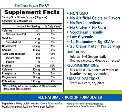 -. Feature : Clean and Natural 25 grams of protein per serving 4 grams of glutamine per serving, to aid digestion and support the immune system Low glycemic -- doesn't spike blood sugar levels. / 5 grams BCAAs (Branch Chain Amino Acids) per serving, to help with athletic post-training recovery, either from muscle damage or fatigue Bioactive Protein Peptide System. / Not altered with a single amino acid to spike protein content No artificial colors, flavors or artificial sweeteners. / Gluten, corn and soy free Non-GMO Only 95 calories per serving One 25 gm serving provides 50% of your required Daily Value (DV) No added fillers or binders, no gelatin or bulking agents. / Only four ingredients! Amazing taste -- not chalky, clumpy or grainy; no strange aftertaste Safe for those who have lactose tolerance issues Easily digestible Outstanding P.R.Ice.