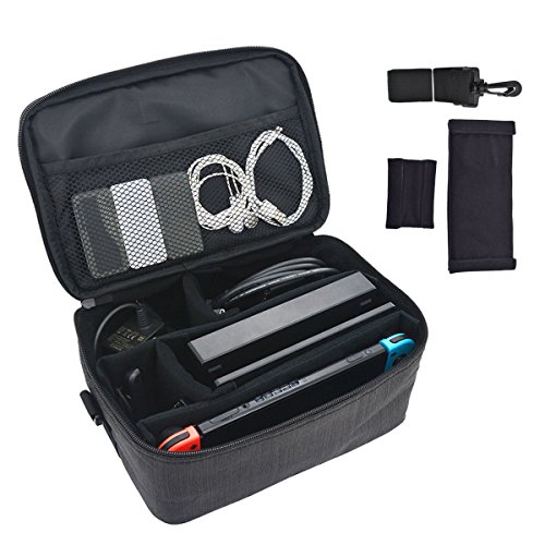 -. Feature : 特徴:匂いが強いのEVAを使っていないので、衝撃吸収にちょっと弱いが、軽量し、嫌い匂いもありません。どころが、帆布とビロードの間に厚手のスポンジが入っているデザインで、普通の場合で、完全な保護を提供できます。 / 仕切りが自由:4枚の2種類サイズが違う仕切り(ビロード+スポンジ)付き、場合によって、入れたい主体(Nintendo Switchはもちろん、New3DSやNew3DSや3DSLLも可能です)とアクセサリを自由に配置できます。 / 収納力:Nintendo Switch本体、Joy-Conグリップ/Joy-Con充電ブリップ、Nintendo Switchドック、Joy-Conストラップ、ACアダプターが収納可能です。着脱式の柔らかい仕切りで、アクセサリを分類して収納しながら、本体と他の部分を仕切って、クッション性もあります。メッシュポケットにはHDMIやUSBケーブルやゲームカードケースなども収納できます。 / 持ち運び自由:PU製のハンドストラップがあるし、ナイロン製のショルダーストラップもあるし、ご都合により、ショルダー持ちと手さげの持ち方を自由に選べます。 / パッケージ:1x Nintendo Switch対応 大容量バッグ、4x ビロード仕切り、1x ショルダーストラップ、1x 感謝カード。保証期限:18カ月、終身に技術サポートを提供しています。