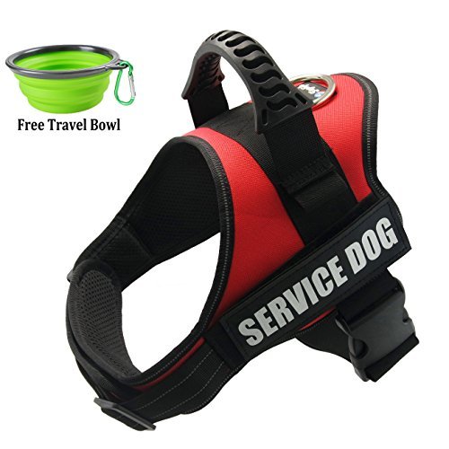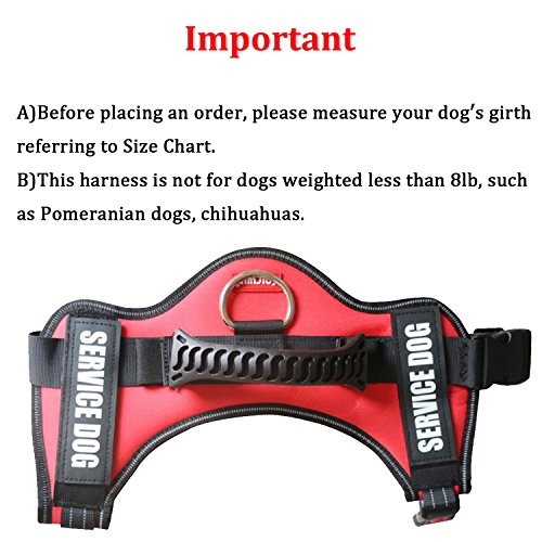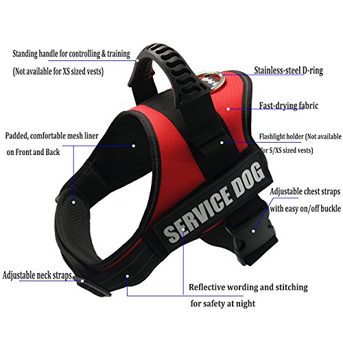 Features:? - Comfort first - Both back and neck straps are padded with a high-elasticity sponge and completed by breathable mesh lining. - Removable / Interchangeable Patches: not just for service dogs or in-training dogs. You can use different patches (not included) and make it an ESA dog vest, a medical dog vest or a therapy dog vest! - Stainless Steel D-ring for leashes and ID tags - this service dog harness can be used without a collar or any other secondary restraint. - Upgraded Top-mounted Standing Handle (with flashlight brackets on both sides for L/XL sized vests). - Easy-to-adjust neck straps and chest straps for custom fitting. - Belly Buckle makes it so easy to put on and off. - Vivid Color, Reflective Patches and Edging look beautiful and stand out, keep your dogs safe at night. - Not intended for water activities. Hand wash and hang dry.