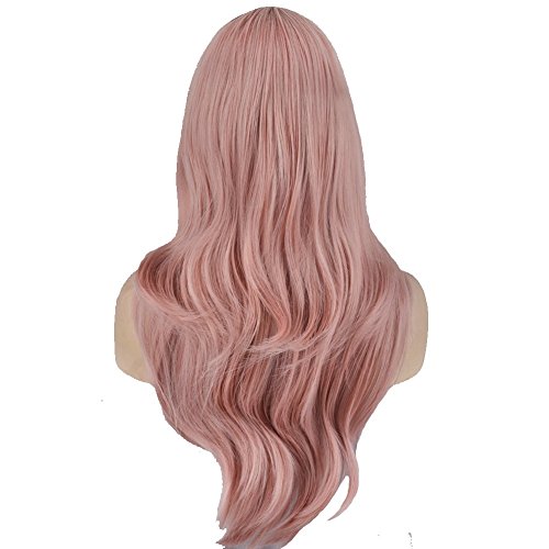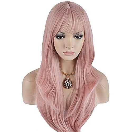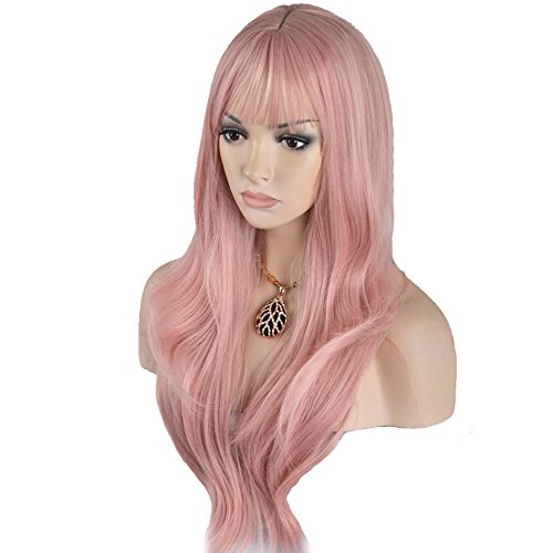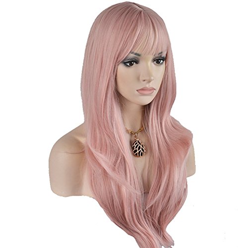 RightOn 28'' Long Curly Wavy Soft Hair for Women Girls Synthetic Wig with Straight Bangs Wig Cap Included (Chisato Pink)