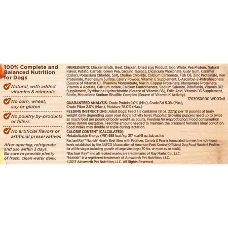 Rachael Ray Nutrish Hearty Beef Stew Recipe is made with hearty chunks of beef plus garden vegetables like peas, carrots and potatoes, all simmered in a yummy homestyle beef gravy.Feature