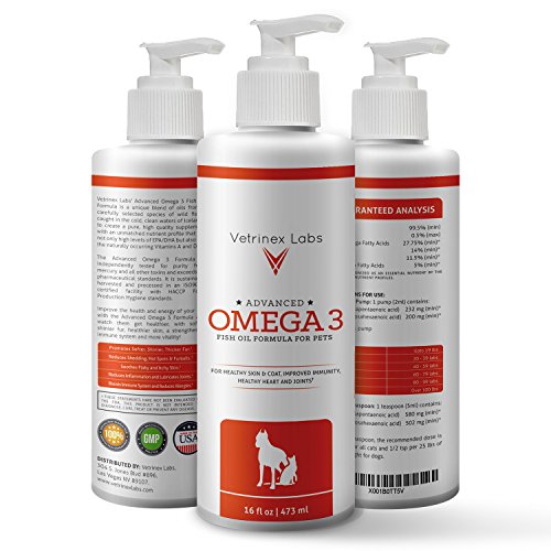 All Omega 3 Supplements for Pets are not created equal - some have a something a little extra - A Unique blend of oils from 5 carefully selected species of wild caught fish to give your pet an unmatched profile that is not only high in Omega-3 and Omega-6, but also Vitamin A and D. Small wild caught fish have much lower levels of toxins from heavy metals such as mercury, while containing higher EPA and DHA, and Cod Liver Oil adds naturally occurring Vit A & D. The Vetrinex Labs Advanced Omega 3 Formula for Dogs and Cats is an amazing new Fish Oil for Pets that helps every Pet Parent to see your pet with a shiny, silky coat with no dry, itchy skin and See your pet show a remarkable improvement in skin and coat health and energy levels within the first bottle! Don't wait any longer to See an Improvement in Dry, flaky, itchy skin, reducing shedding, hot spots and furballs. Boosted Immune System & Heart Health, Reduced Allergies. Softer, Shinier, Thicker Fur! - Order Now!