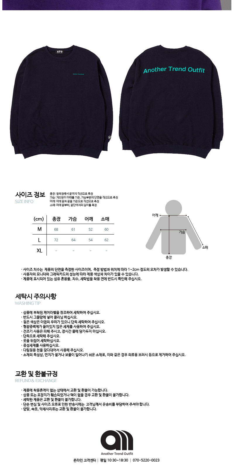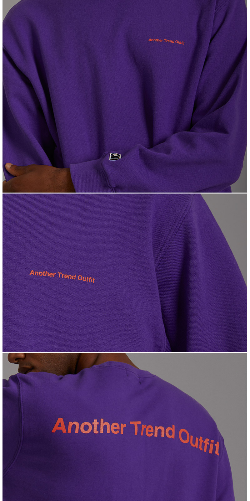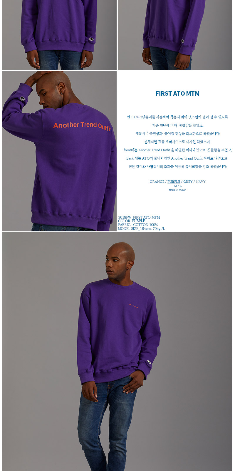 | 면 100% 3단쮸리를 사용하여 착용시 핏이 멋스럽게 떨어 질 수 있도록 기존 원단에 비해 중량감을 높였고, 세탁시 수축현상과 틀어짐 현상을 최소한으로 하였습니다. 전체적인 핏을 오버사이즈로 디자인 하였으며, front에는 Another Trend Outfit 을 배열한 미니나염으로 심플함을 주었고, Back 에는 ATO의 풀네이밍인 Another Trend Outfit 타이포 나염으로 원단 컬러와 나염컬러의 조화를 이용해 유니크함을 강조 하였습니다. |
