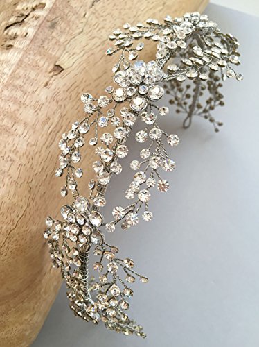This headband is a nature inspired piece with vines encrusted with rhinestones connecting beautiful sparkling rhinestones in a floral design. Floral Couture Headband is elegant and natural. The ornamented portion of this headband measures 16" and approximately 2 ½" wide. Pin loops are located at both ends to allow you to easily fasten the tiara in your hair with bobby pins.Feature