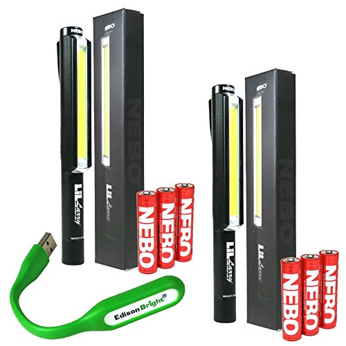 2 PACK Nebo LiL Larry 250 lumen 6373 Flashlight Super Bright COB LED Magnetic Worklight, Black with 6 Nebo AAA batteries and EdisonBright USB powered reading light bundle