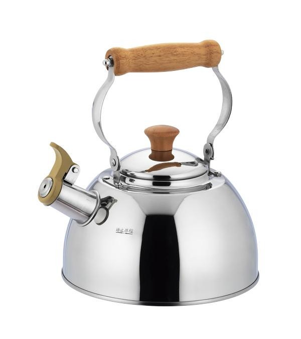 | 沸騰を優しく知らせる笛吹タイプのケトルです。金属軸貫通ハンドル構造。電磁調理器対応です。 |