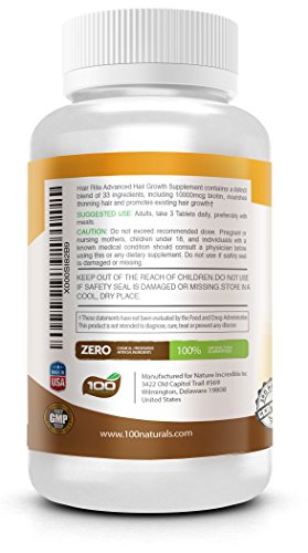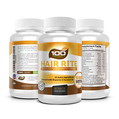 - Feature : ★ Intensive Hair Rescue Formula: Hair Rite's unique and unprecedented 33 high-quality ingredients formula helps improve hair vitality, density and elasticity, and helps curb hair from thinning triggered by nutrient deficiencies in both women and men. / ★ Maximum Strength Biotin: Hair Rite has 10000 mcg which is 2 times more than other hair growth vitamin supplement. / ★ Enhanced Absorption with Black Pepper and Coconut Oil: Better absorption leads to increased bioavailability and better results. / ★ Proudly Made in the USA: All 100 Naturals Products are proudly manufactured in the USA by FDA-registered GMP certified facilities that meet the most stringent requirements for manufacturing nutritional supplements. / ✔ All 100Naturals Products are Backed by an Unprecedented Five 100% Guarantees ✔ : All products are 100% Naturals | 100% Drug Free | 100% Satisfaction Guarantee | 100% Full Refund If you Are Not 100% Satisfied for ANY Reason in 100 Days