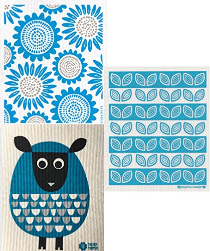 Swedish Dishcloth, (TU) Set of 3 TURQUOISE Sheep, Flowers & Leaves